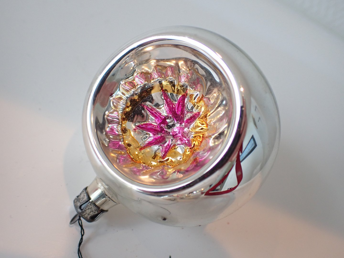 5. stk. glasjulepynt, store reflektorer. Håndmalede centre i forskellige farver. Tyske ca. 1950. Højde 7 cm. Udstiller