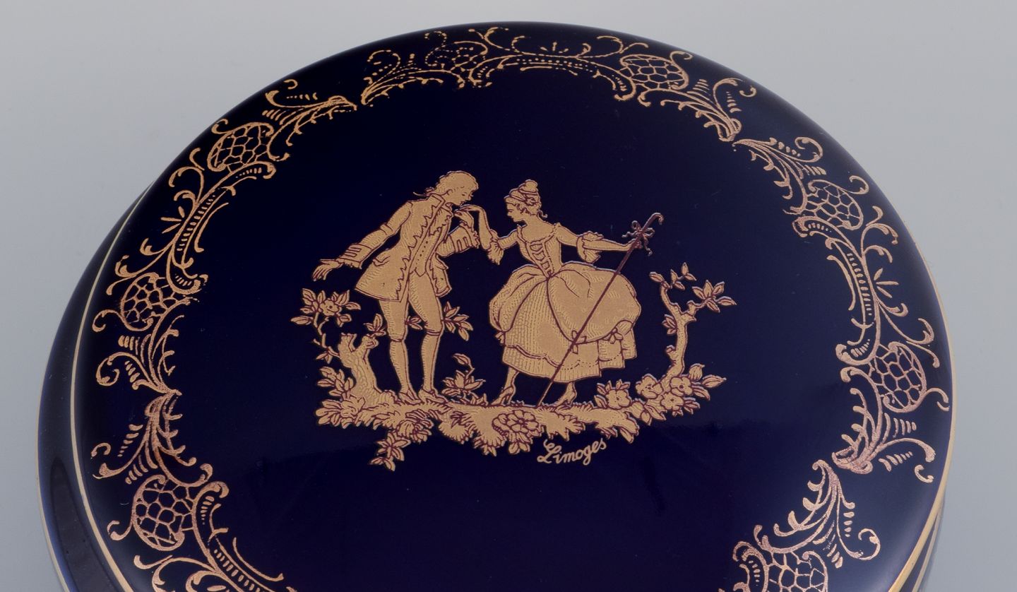 Limoges, Frankrig. To runde lågkrukker i porcelæn. Dekoreret i 22-karat bladguld. Smuk kongeblå glasur. Scène galante.Ca. 1970.