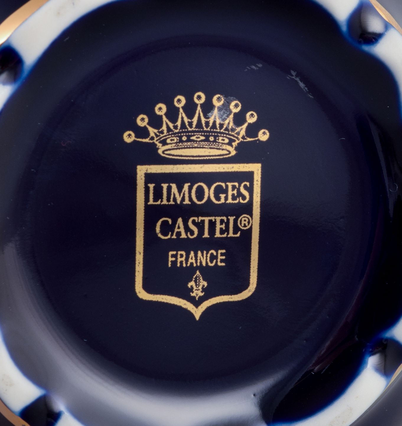 Limoges, France. Two porcelain lidded jars in porcelain, decorated with 22-karat gold leaf and beautiful royal blue glaze. Scène galante.Approximately 1970.