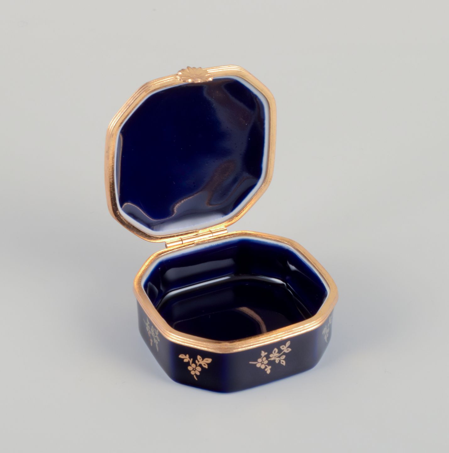 Limoges, France. Four lidded porcelain boxes, two with brass mounts, decorated with 22-karat gold leaf and a beautiful royal blue glaze. Scène galante.Approximately 1970.