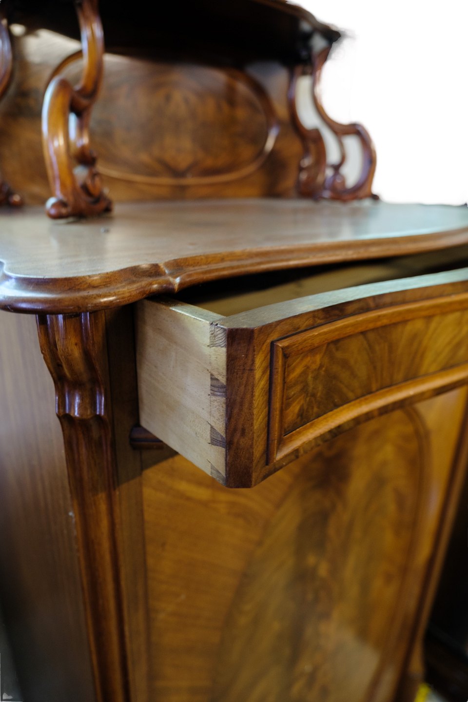 Skab af mahogni med låge og 3 hylder dekoreret med træ udskæringer og intarsia fra omkring år 1880'erne.Mål i cm: H:175 B:88 D:46