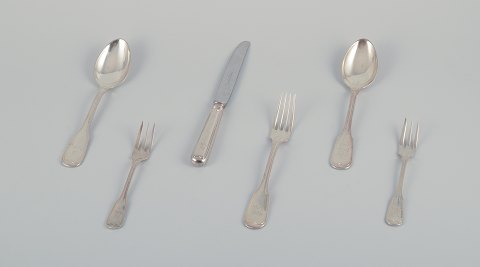 Robbe & Berking, tyskland. Fem dele bestik i nysølv bestående af en middagskniv, en middagsgaffel, to spiseskeer og to pålægsgafler.Midt 1900-tallet.