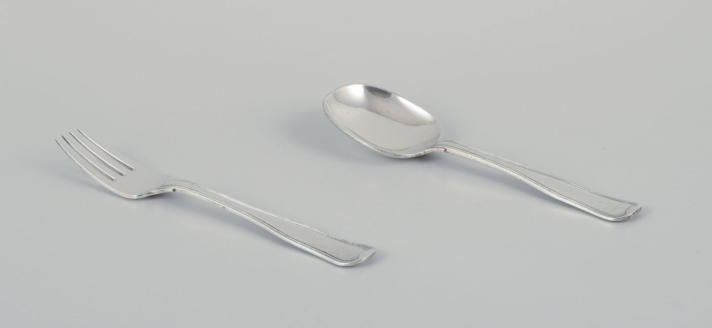 Georg Jensen. Dobbeltriflet barnebestik i sterlingsølv.Bestående af en barnegaffel og en barneske.
