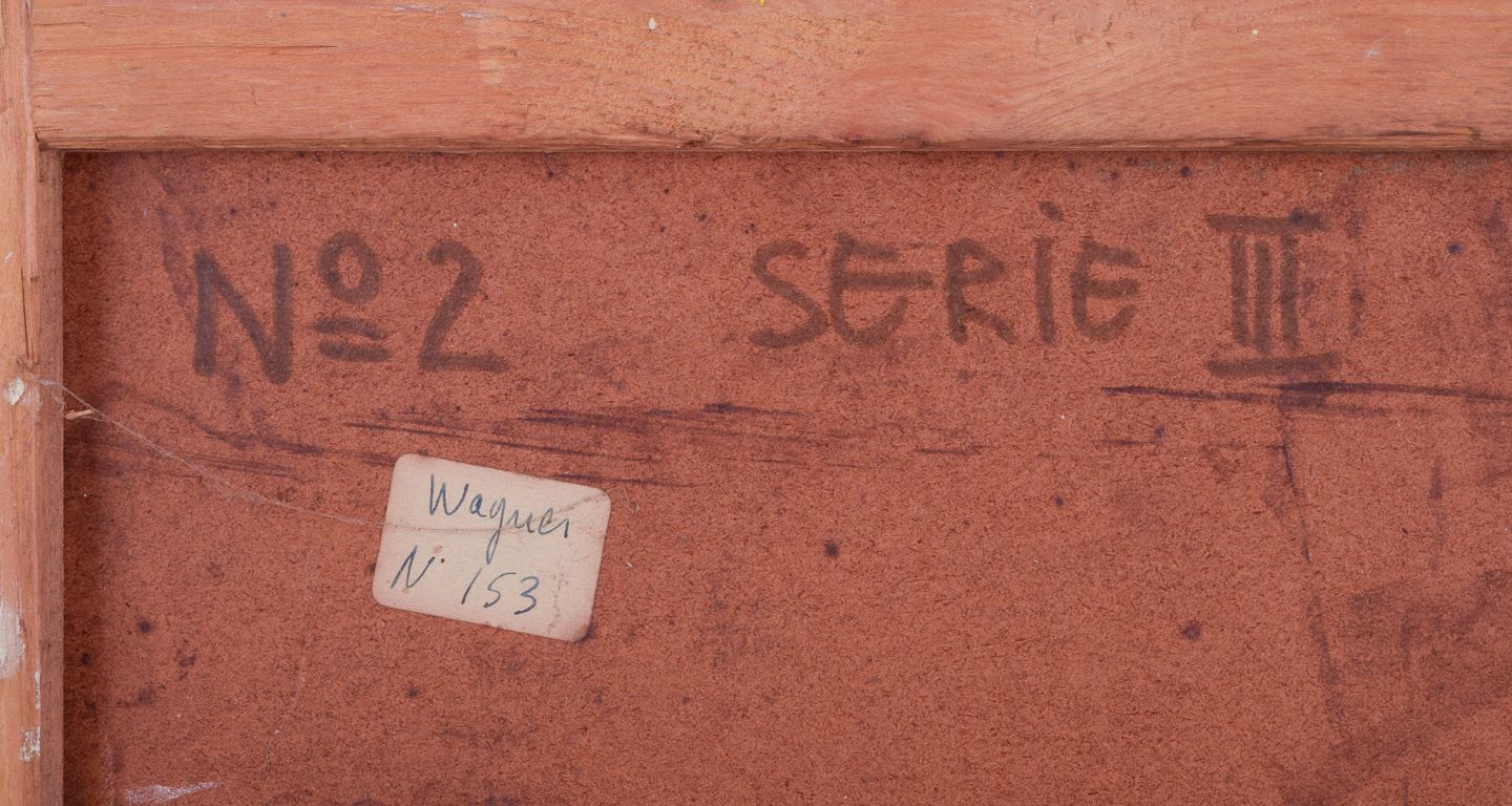 R. Wagner, europæisk kunstner. Olie på plade. Geometrisk komposition.Dateret 1970.