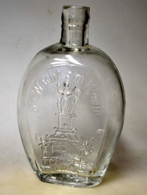 Tysk lommelærke i klart glas, 19. årh. Med motiv og teksten: Die Wacht am Rhein. H.: 12,5 cm. 1/8 L.Perfekt stand!