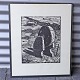 Indrammet grafisk tryk i skifteramme. Træsnit med landskabsmotiv fra år 1983 med motiv af opsat møllesten.Kunstner Poul Sørensen f. 1931-2018