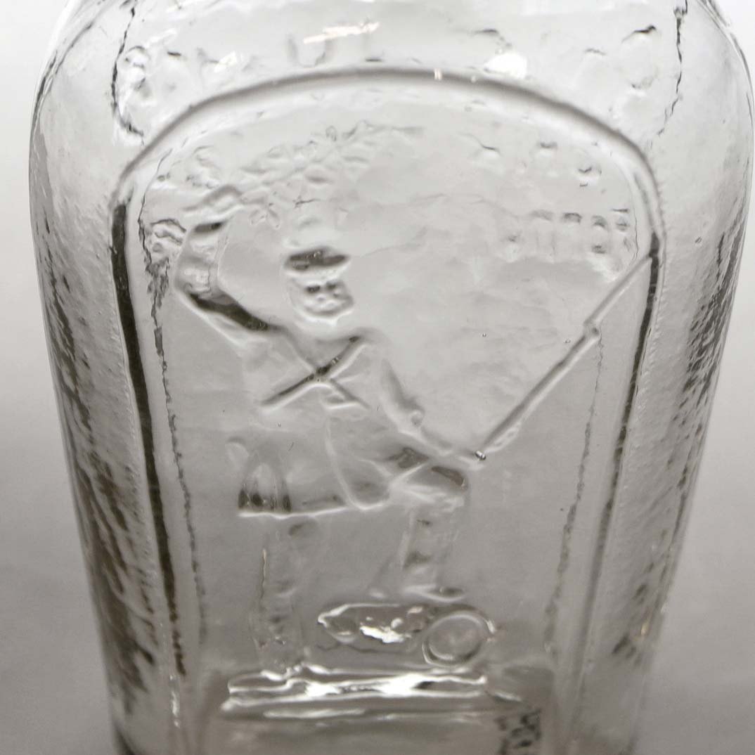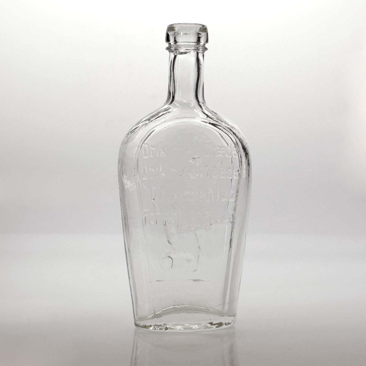Antik lommelærke i klart glas med motiv af soldat med kvist og gevær med bajonet samt teksten: Drik med glæde, drik med maade, drik men lad fornuften raadeFremstår med lettere urenheder i glasset