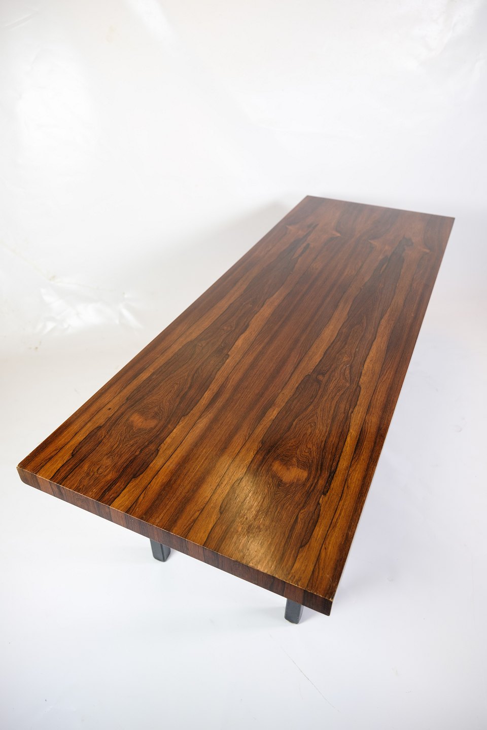 Dette sofabord er et pragtfuldt eksempel på dansk design fra 1960'erne, hvor det møder æstetik og funktionalitet i perfekt harmoni. Med en ramme af sort lakeret metal og en top af palisander udstråler dette bord en tidløs elegance og modernitet.Det slanke og strømlinede design giver bordet et let og luftigt udtryk, mens det samtidig er robust og holdbart. Den kontrasterende kombination af det mørke metalstel og det varme palisandertop tilføjer en dybde og raffinement til bordets udseende.