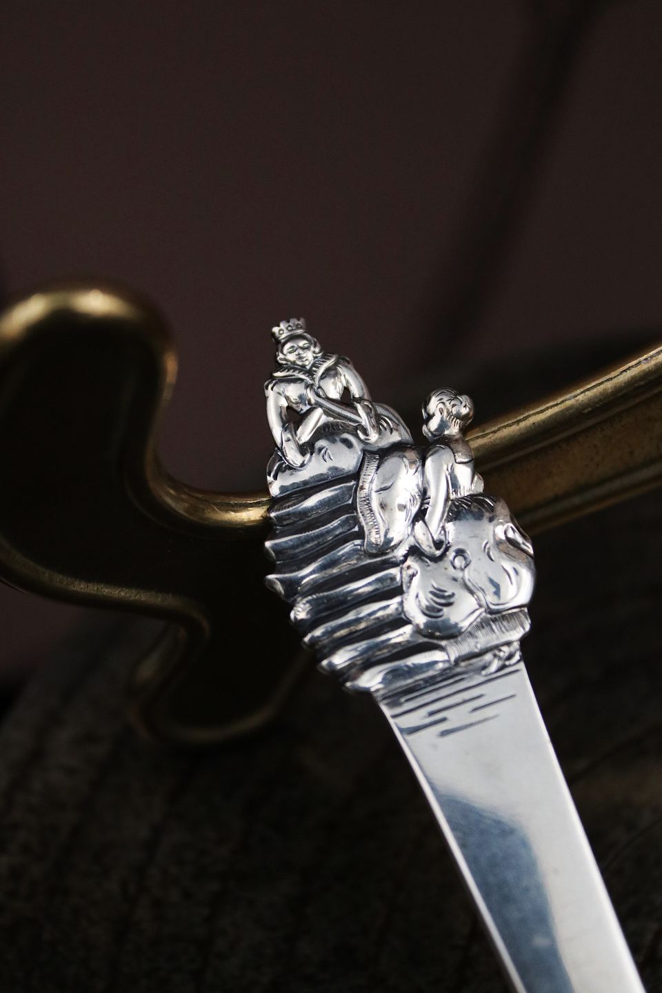 Gammel barnegaffel i sølv med motiv af H. C. Andersens eventur "Prinsessen på ærten" Længde : 14,8cm. Vægt: 26,7 gram.Emne nummer: H.C. Andersen - Prinsessen.