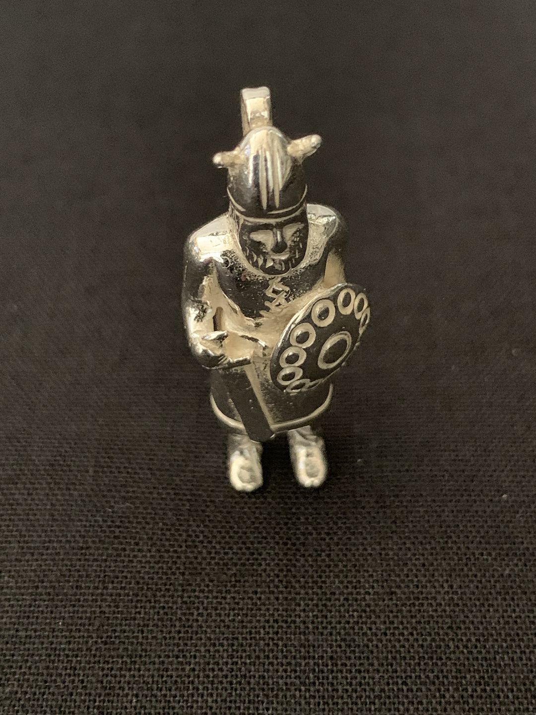 Nice and very detailed pendant in sterling silver, which can be used as a pendant for either a necklace or a bracelet. The iconic motif of a Viking signals strength and brings to mind Norse mythology.Height: 3.5 cm.