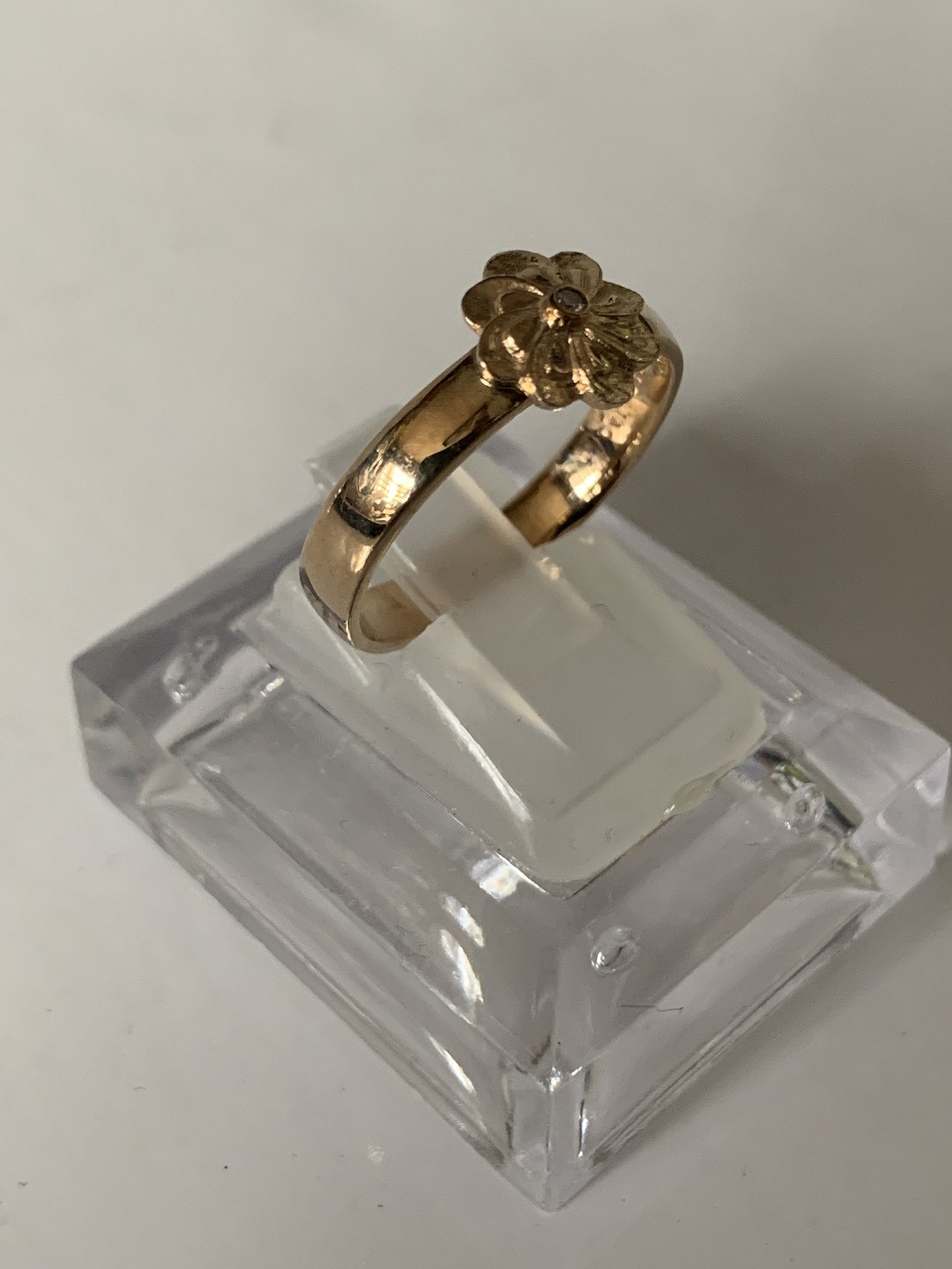 Fin diskret damering, med flot motiv af blomst med hvid sten i midten. Ringen er enkel i opbygningen, men feminin med den fine blomst. Ringen kan bruges af såvel unge som ældre kvinder, hvor den vil være et ideelt hverdagssmykke.Ringen findes ikke fysisk i butikken, men kan fremvises efter ønske.