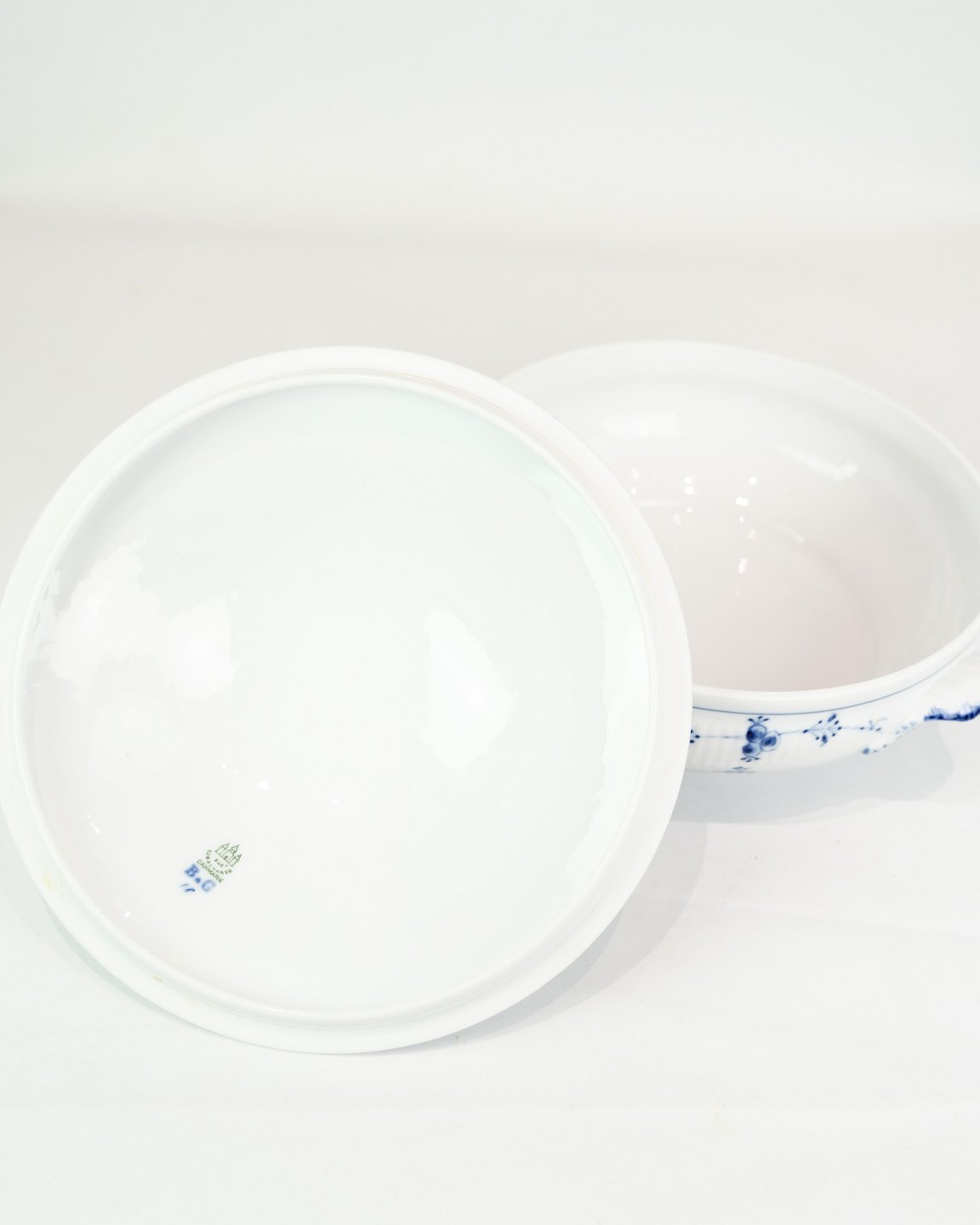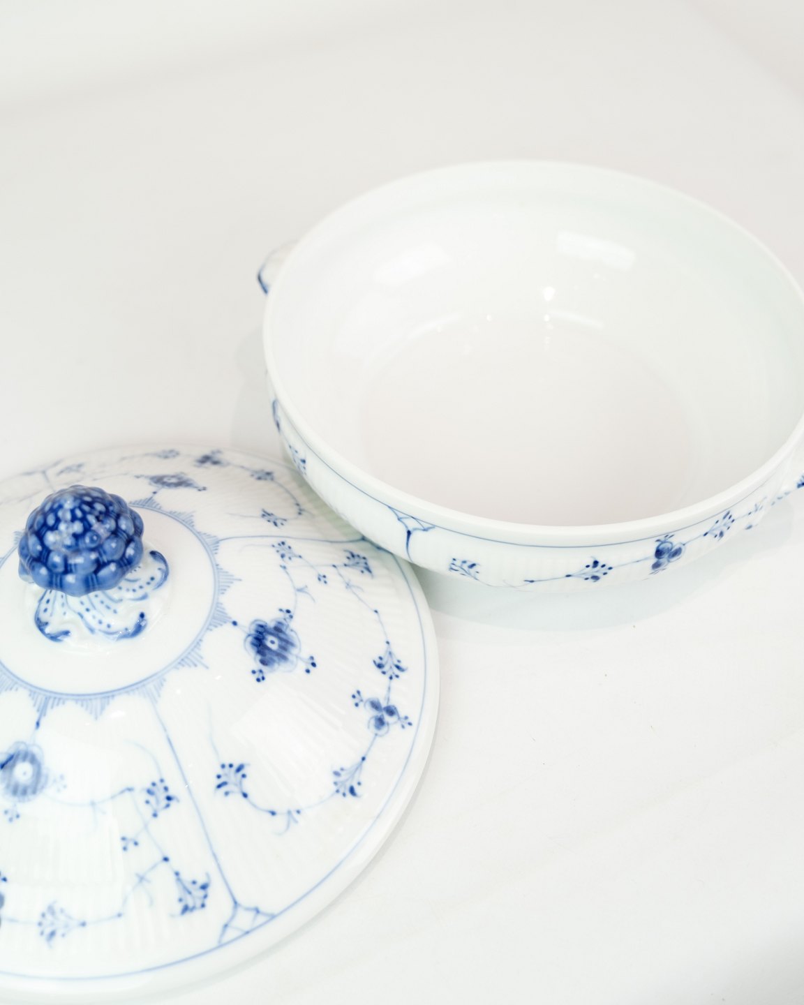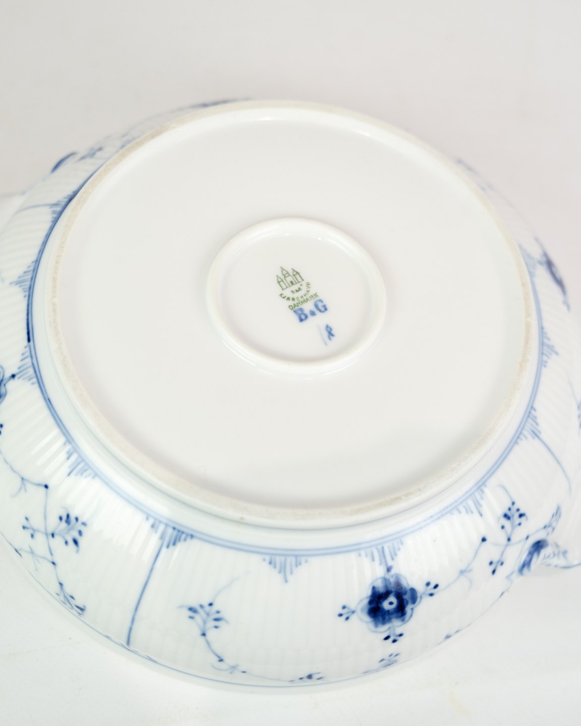 Gammel rund musselmalet terrin fra Bing & Grøndahl (B&G), sjælden model og 1. sortering. Denne terrin er et unikt stykke porcelæn, der kombinerer klassisk musselmalet design med høj kvalitet fra en af Danmarks mest anerkendte porcelænsfabrikanter.Mål i cm: H:18 Dia:22.5