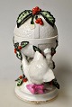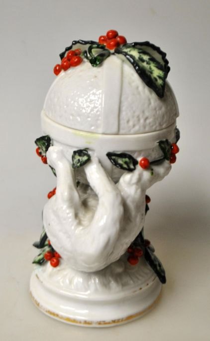 Tysk porcelæns figur af liggende kat, der holder en bold, 19. årh. Hvidt porcelæn med partikulære bemalinger. Endvidere dekoreret med kristtjørn med røde bær. H.: 15 cm.NB: Enkelte blade er knækket.
