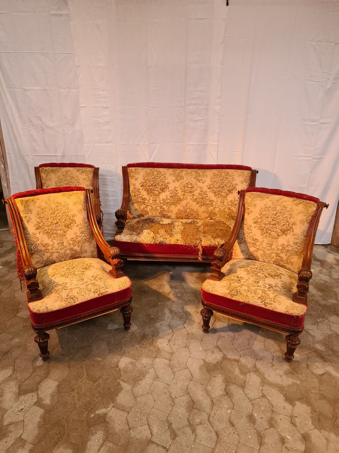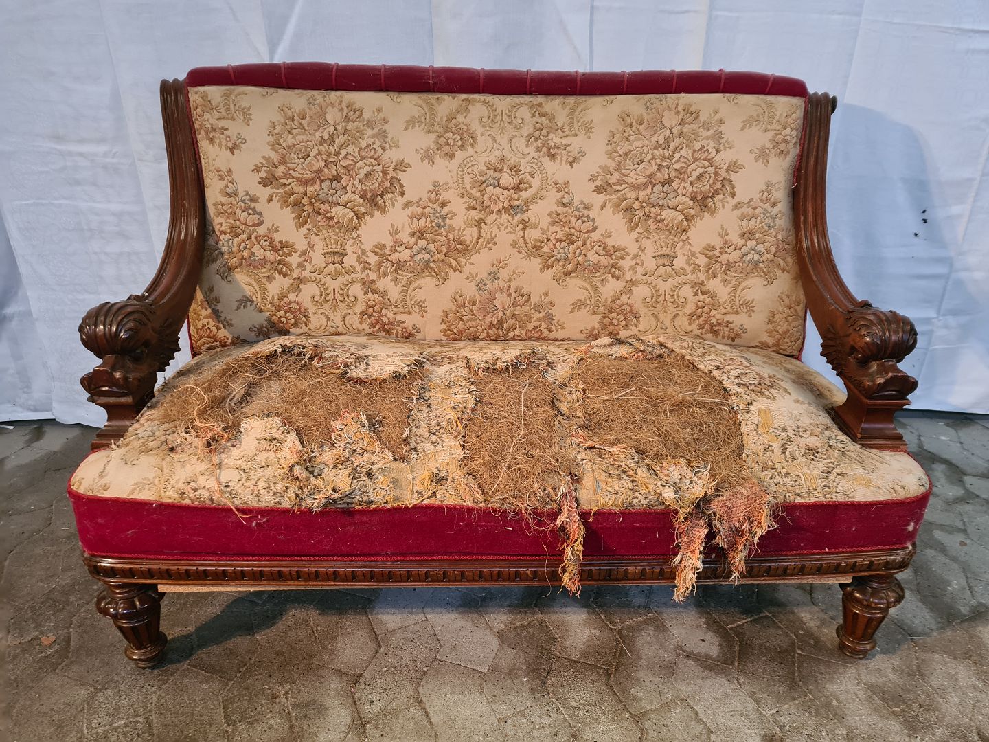 Sofa og 3 lænestole i massivt mahogni, fra 1910erne.Det har defekter og trænger til den store service.