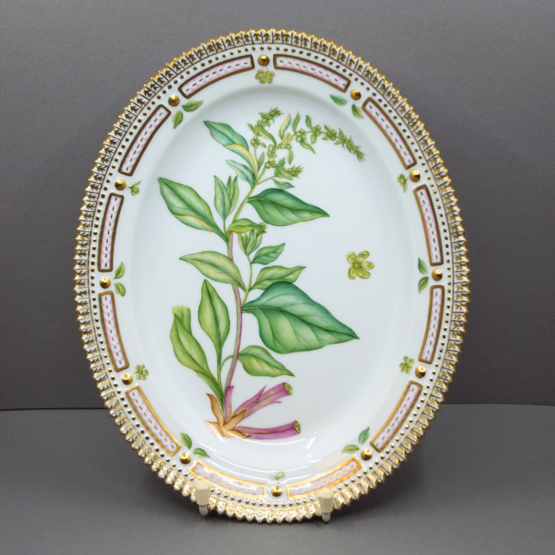 Royal Copenhagen, Flora Danica porcelæn; Ovalt fad.Dekoreret i farver og guld med blomster. L. 25 cm. B. 20 cm. Royal Copenhagen, Danmark. Fremstår med gave skrivelse på bagsiden af fadet (se foto).