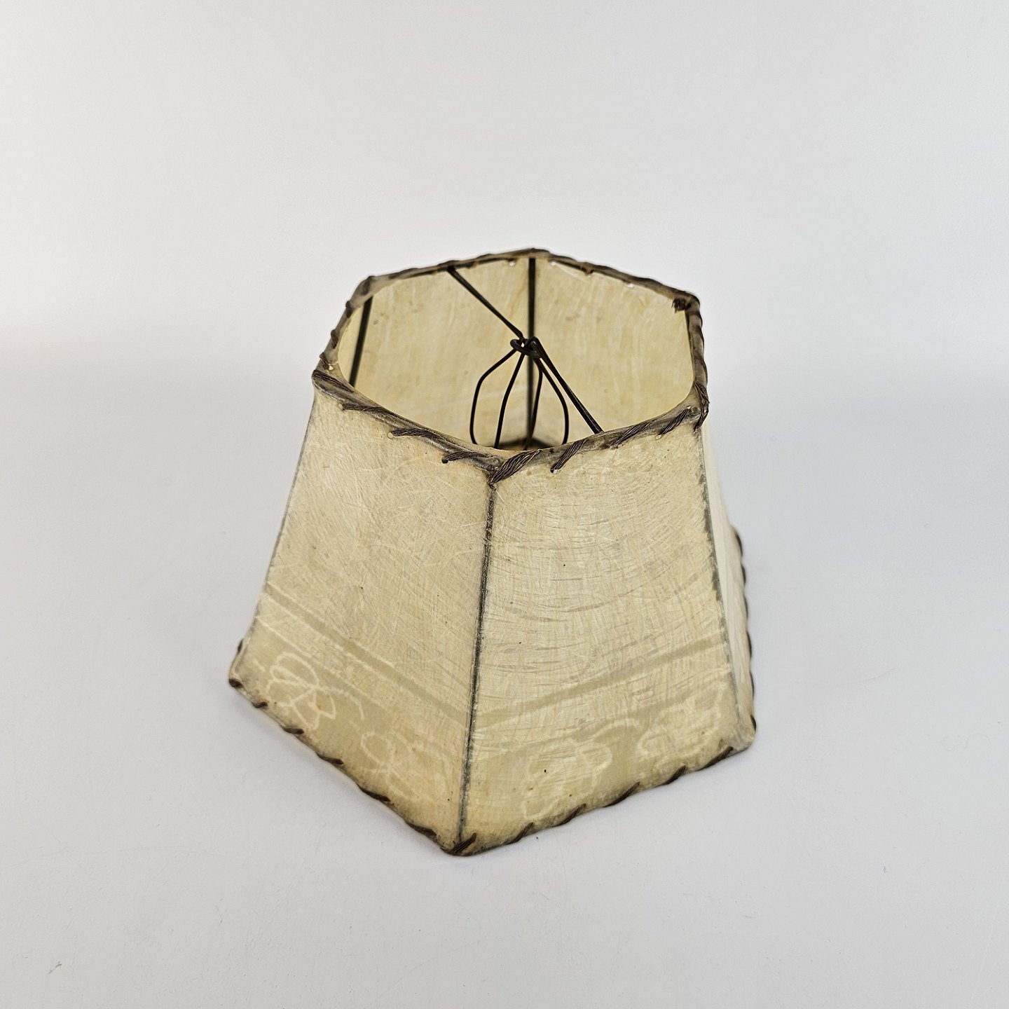 Fire lampeskærme lavet af svineblærer. Der er ridset mønstre ind i dem.Små brugsspor