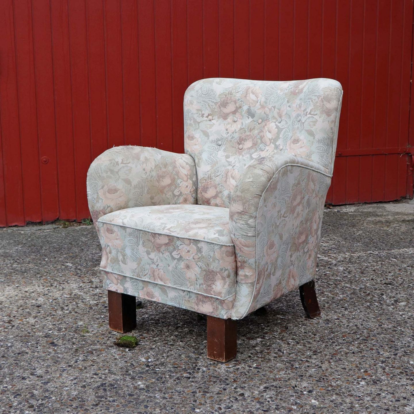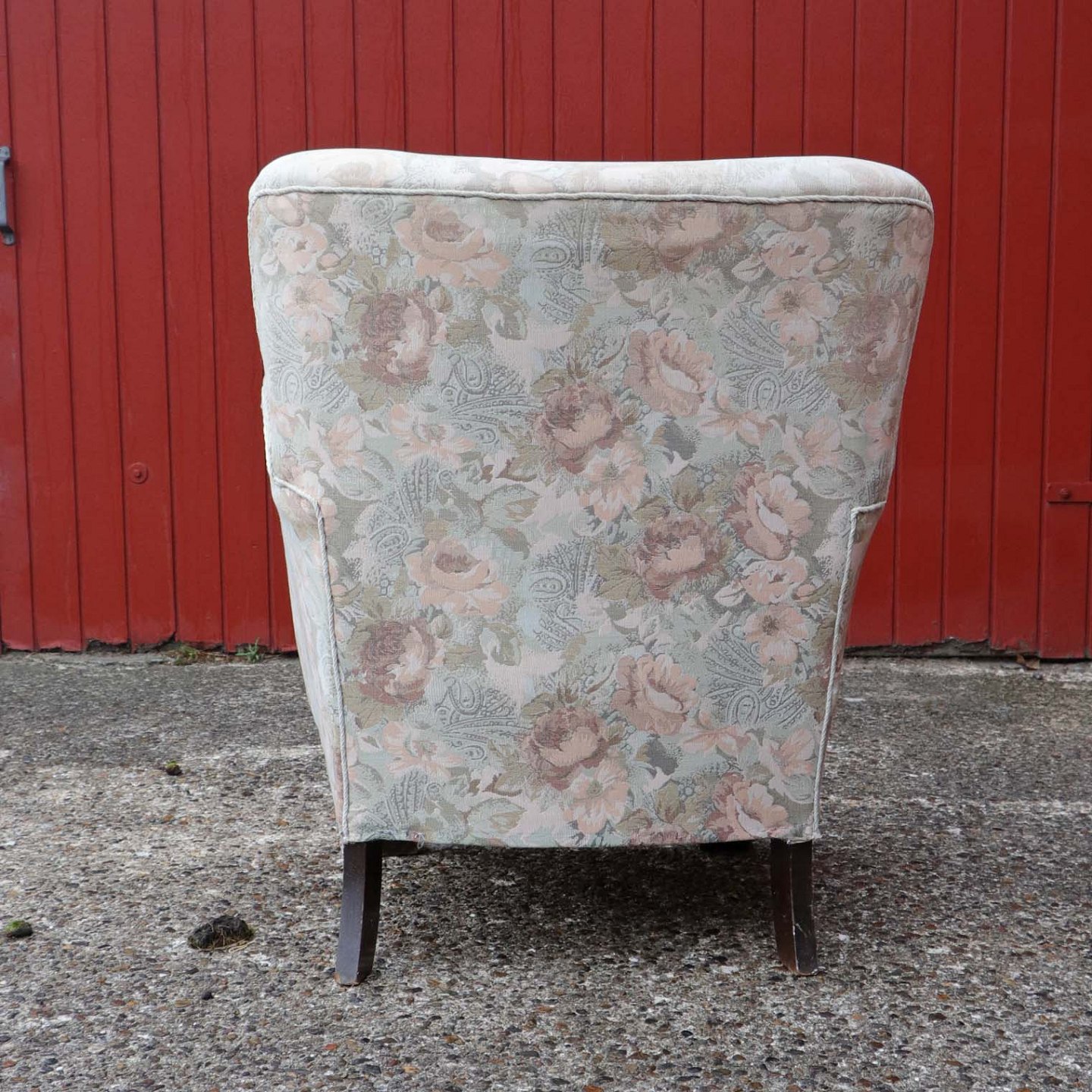 Lænestol med springfjeder sæde og firkantet ben i lakeret mørkt træ. Stolen er betrukket med lyst stof i blomstret mønsterProducent Ukendt
