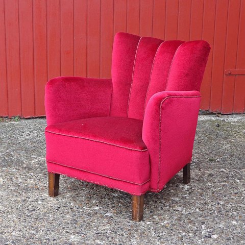 Ældre lænestol med springfjeder sæde. Stolen er betrukket med bordeaux velour stof og har ben af lakeret mørkt træProducent Ukendt