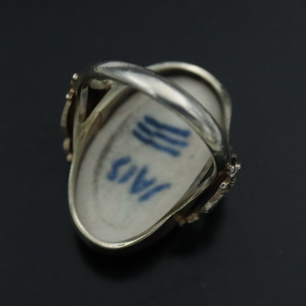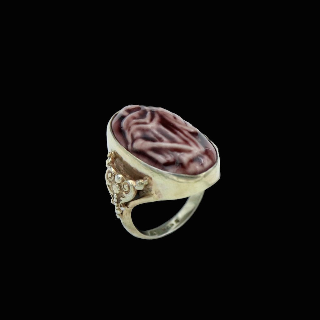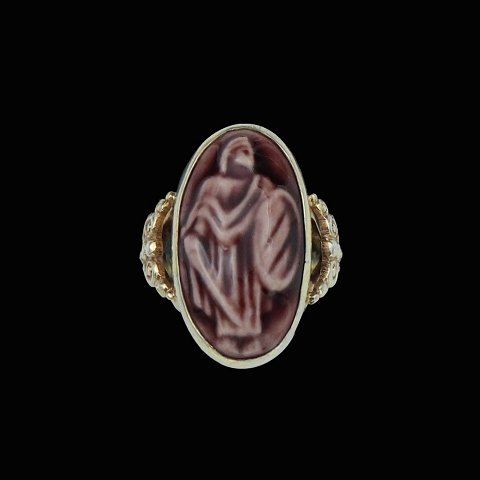 Jais Nielsen 1885-1961. Ring i forgyldt sterling sølv med keramisk relief.Tegnet af Jais Nielsen 1885-1961 og udført hos A. Dragsted & Royal Copenhagen.