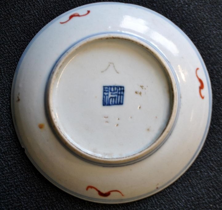 Kinesisk porcelains tallerken, polykron dekoreret, 19. årh. Motiv med blomster og skrifttegn. Signeret. Dia: 12 cm.Emne nummer: 27184