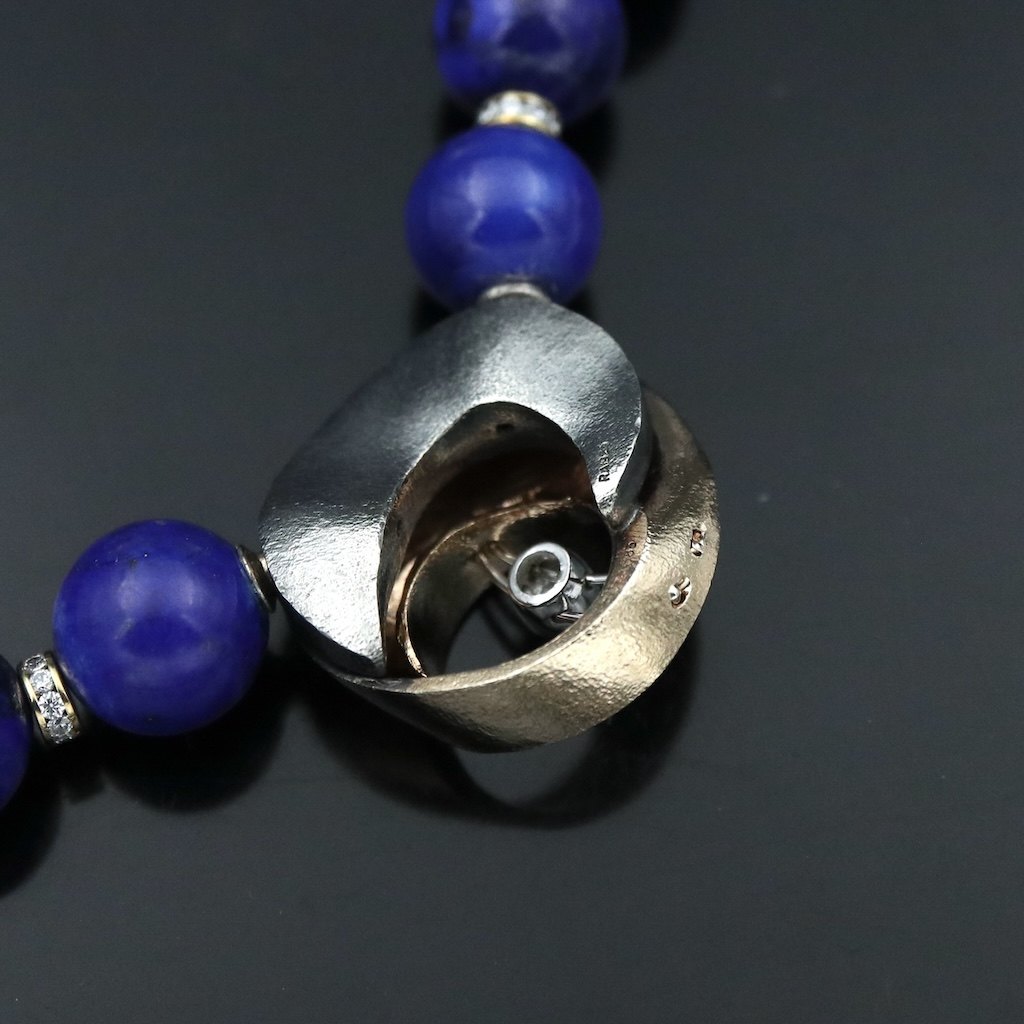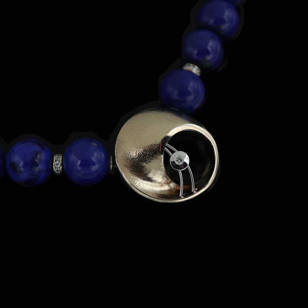 Lapis Lazuli perlekæde med diamantlås i 14k guld og sterlingsølv.1,2 cm. Lapis lazuli kuglehalskæde med fire ringe i 14k guld med brillanter.