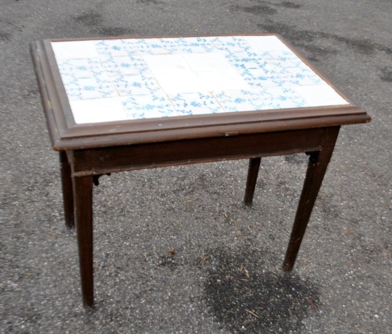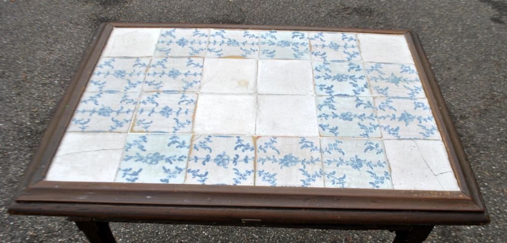 Sjældent originalt brun bemalet flisebord, Louis XVI, 1780, Danmark. Med tilspidsede ben. Med 16 fantastisk sjældne blåmalede ornament fliser med blomster og ranker fra Morsø Fabrikken i mønster. Herudover 8 helt hvide fliser fra samme periode - antagelig fra - København. Det hvide fliser sidder som et firpas i midten og en i hvert hjørne. H.: 70 cm. L.: 89 cm. D.: 62 cm. Proveniens: En gammel stor bindingsværksgård i Hårmark på Samsø. Bordet fremstår originalt - dog med restaureringer, bl.a. med beslag på kanten. Oprindelig har der været en skuffe i den ene ende og udtrækkelige bakker i hver sin ende. De 4 hvide fliser i hjørnene er med defekter.Emne nummer: 27384