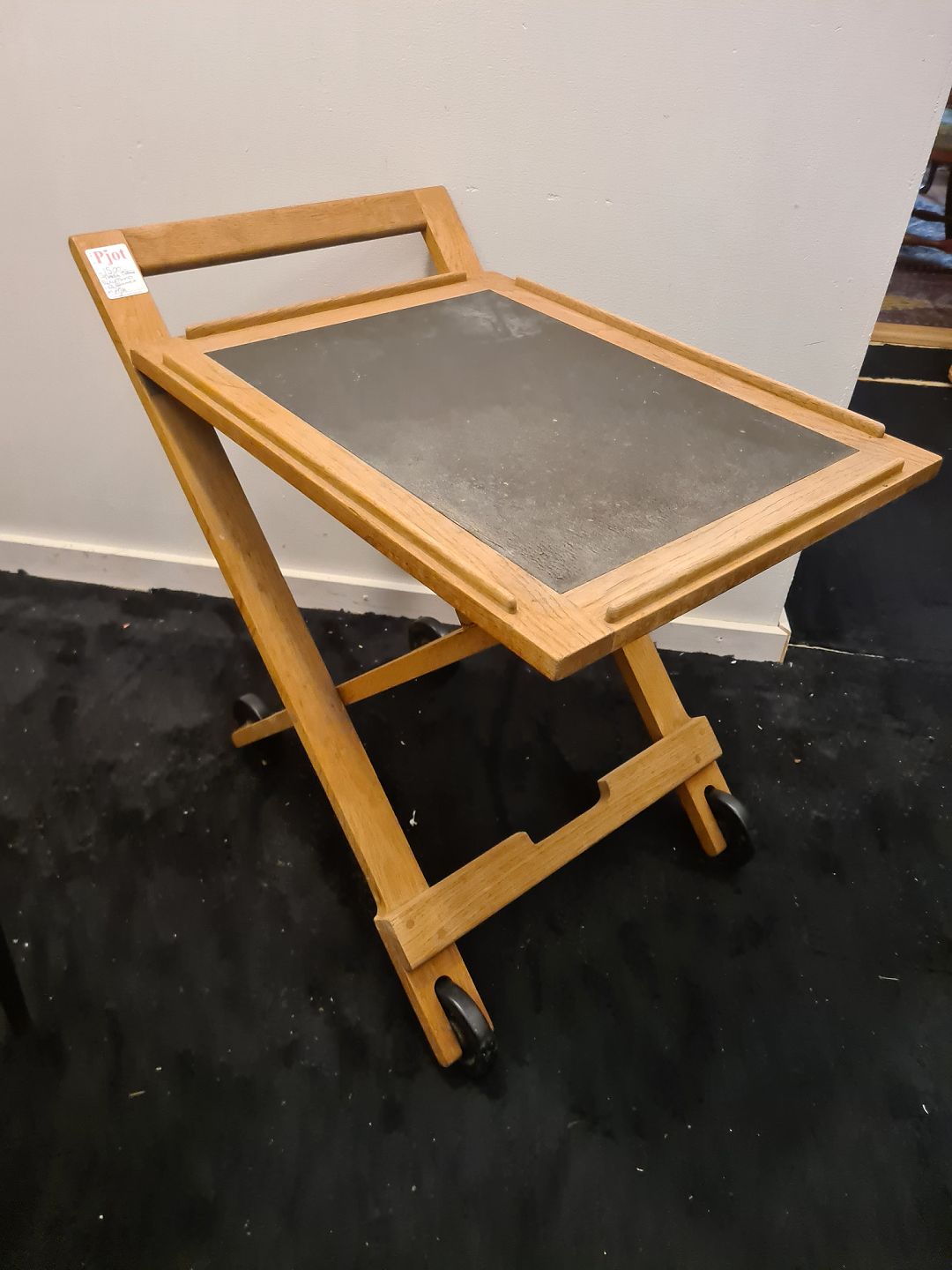 Dansk møbelproducent sammenklappeligt rullebord i eg med hjul i plast ogplade af sort formica. Fremstillet ca. 1970'erne.