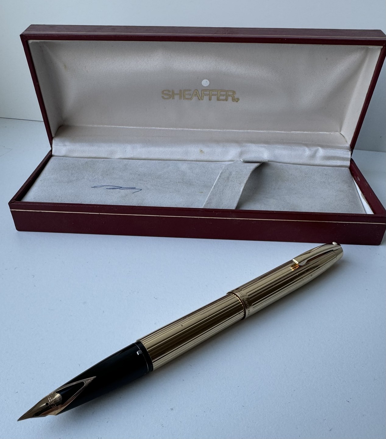 Guld-double Sheaffer fyldepen fremstillet i U.S.A. Fremstår i god og skriveklar stand. Alle dele original og i god stand inklusiv 14 karat 585 guldspids. Rød Sheaffer æske medfølger. Fyldepennen er 13 cm lang.