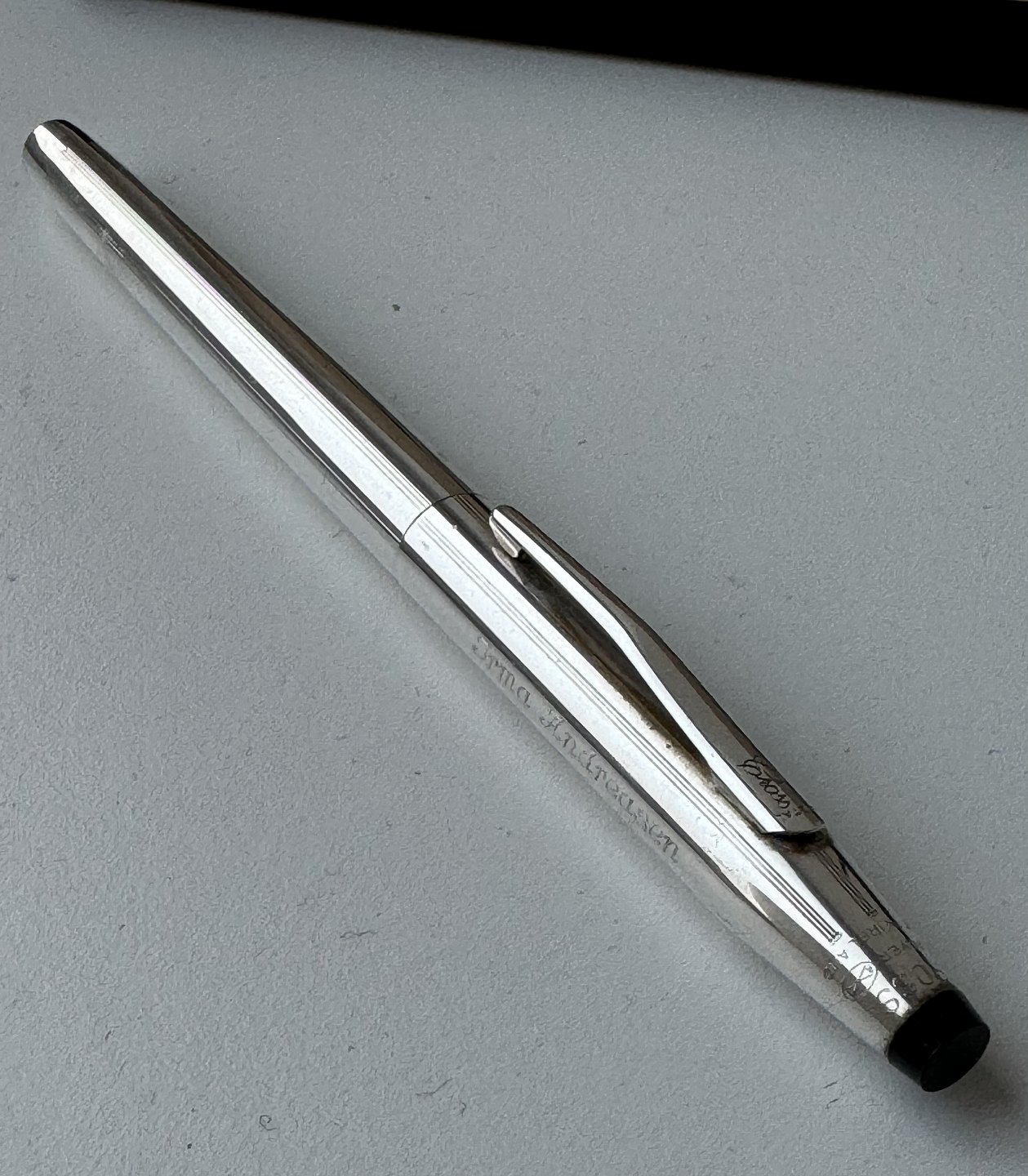 Cross kuglepen i 925 Sterling sølv med original æske. I god stand. Ingen skader eller reparationer. Fabriksmærket samt sølvstemplet. Der skal dog indsættes ny refill så den igen kan skrive. Indgraveret personlig navn (kan fjernes af sølvsmed). L. 13,5 cmv/ Jesper Reutemann