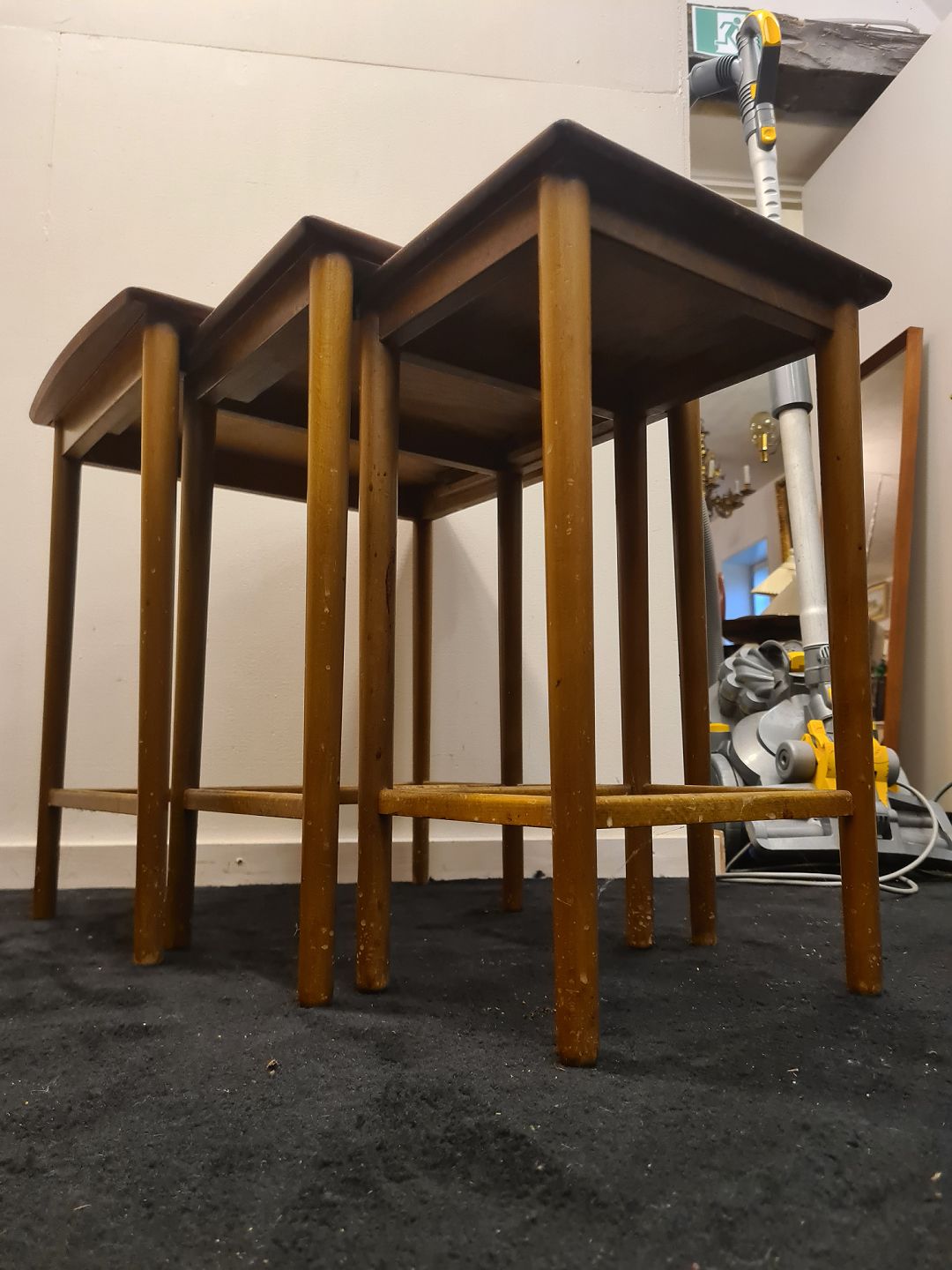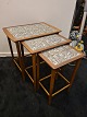 Dansk møbelproducent sæt indskudsborde m. plade i teak og kakler i stentøjsamt stel af bøg. Produceret ca. 1970'erne.