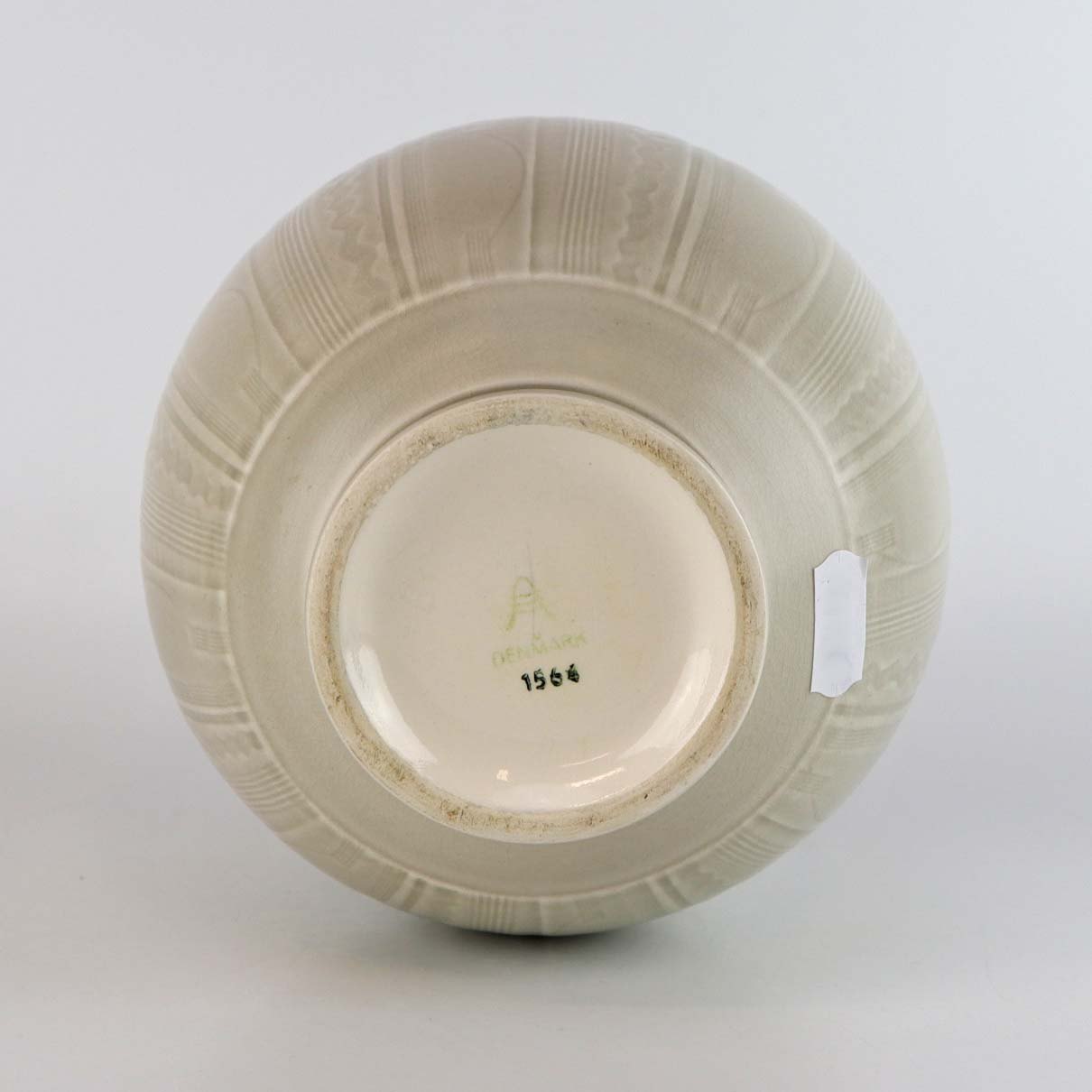 Æggeformet vase i fajance med råhvid glasur og dekoreret med stribet og bølget mønster. Nr. 1564Formgiver Nils Thorsson