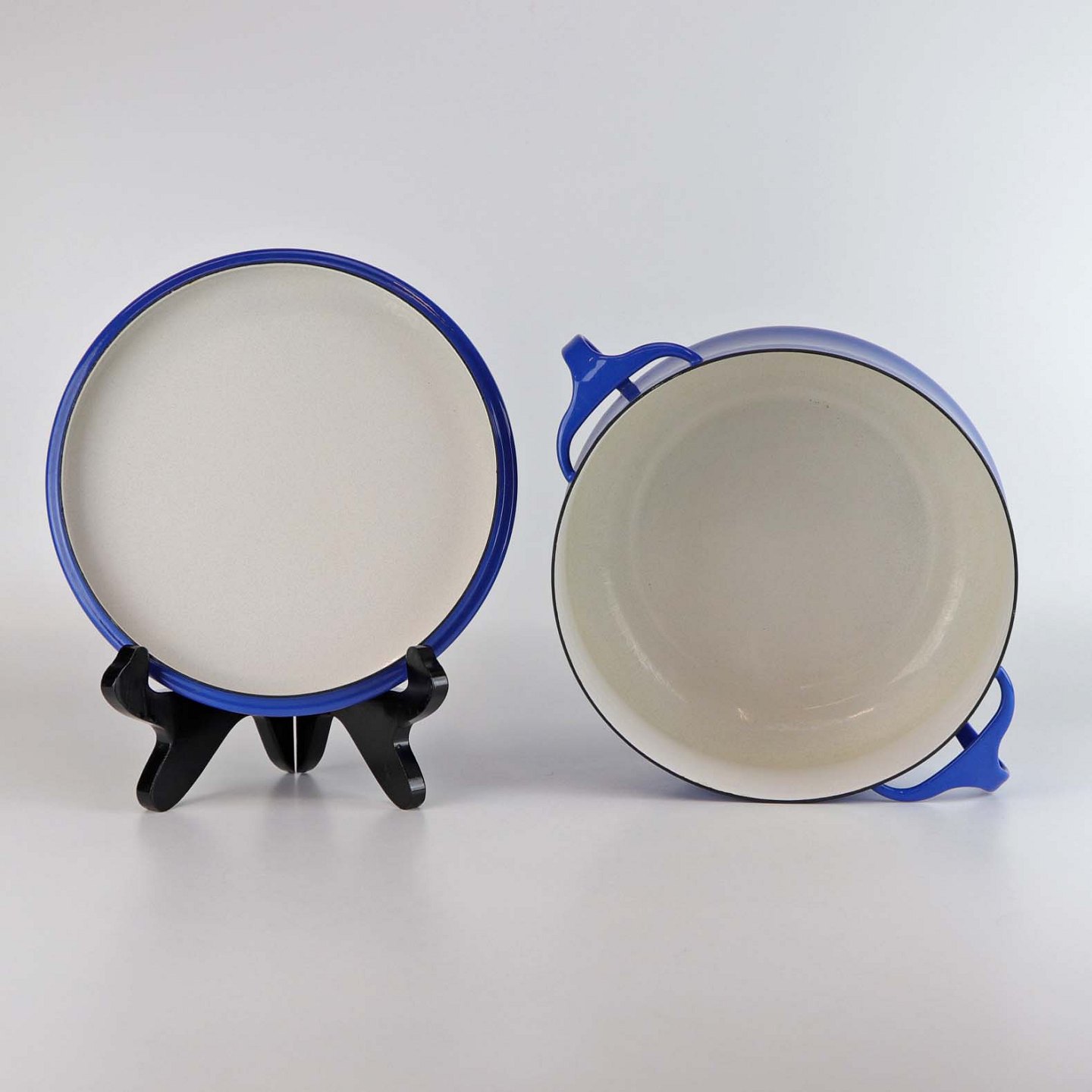 Kasserolle med låg fra serien Kobenstyle fremstillet i metal og belagt i blå og hvid emalje. Model FranceFormgiver Jens Harald Quistgaard