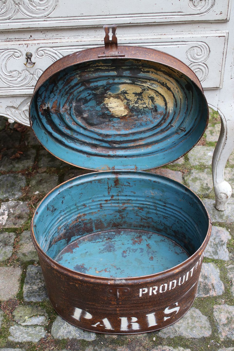 Gammel oval metal box med gammel original bemalingog fin patina. Og skrift på siden ”Paris” H:28cm. 41x34cm.