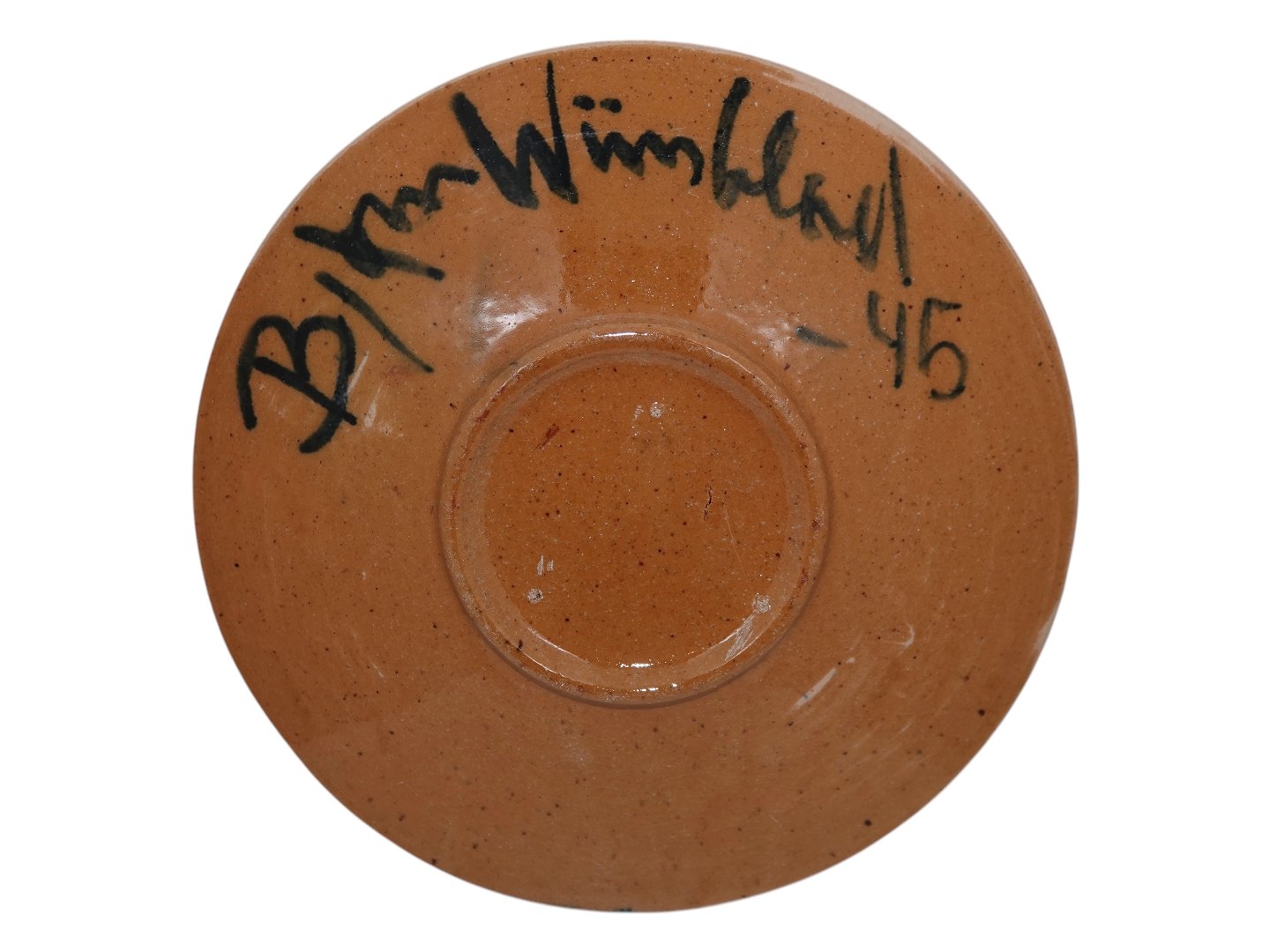 Skålen er fuldt signeret og med årstal 1945. Bjørn Wiinblad har altså lavet skålen, da han blot var 26 år gammel. Skålen er givet som gave af Wiinblad selv til nogle personlige venner.