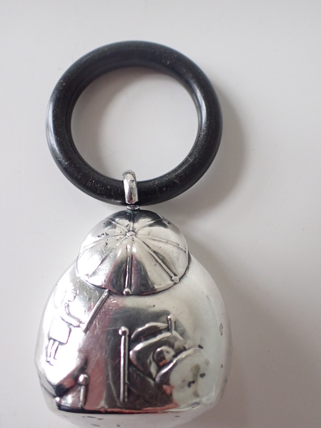 2 sølvrangler og 3 pletrangler.1 rangle i 830 sølv med Ole Lukøje og sort plastring. Ca. 1950. Højde. 5 cm. Bredde3,9 cm. I pæn stand med tistypisk slid. Pris: 500 kr.