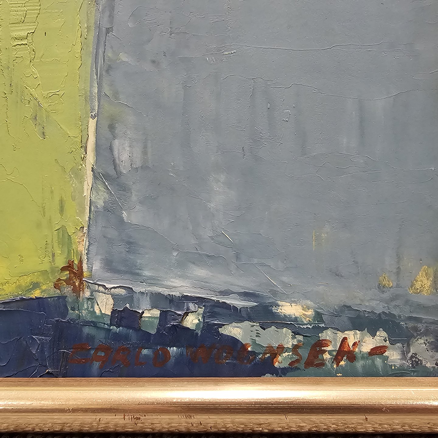 Maleri af Carlo Wognsen, med motiv af en mand der går imellem huse.Signeret