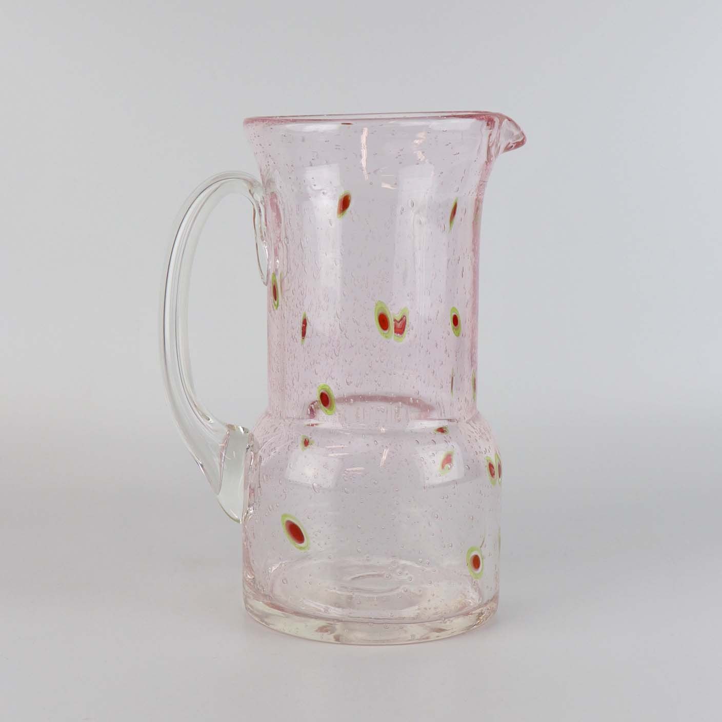Vandkande i klart lyserødt glas med boblemønster samt grønne og røde ovale motiverProducent Henriques A/S, Moritz R
