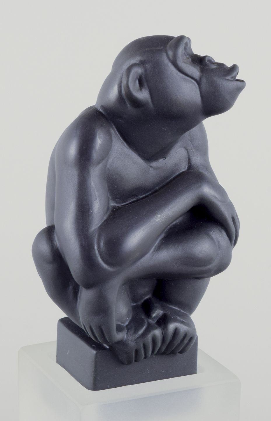 Pia Langelund for Royal Copenhagen. Figur af chimpanse i i bisquit monteret på sokkel af matteret glas.Datering: Sent 1900-tallet.