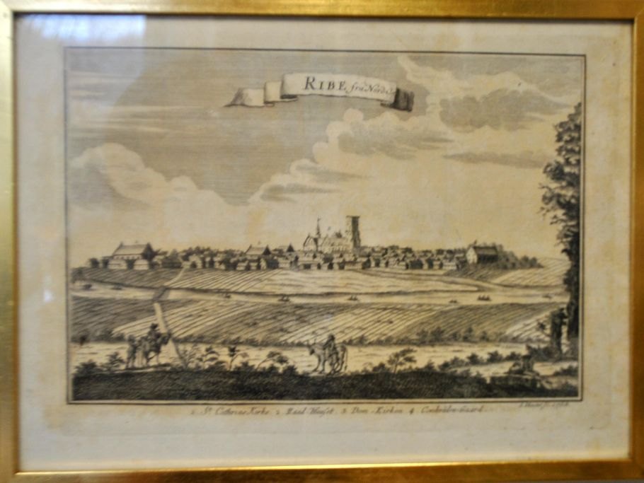 Haas, Jonas (1720 - 1775) Danmark: Ribe fra nord. Kobberstik, 1768. Originalt kobberstik. Signeret: I. Haas 1768. H: 17 cm. B: 25 cm.Indrammet: H: 23,5 cm. B: 31,5 cm.