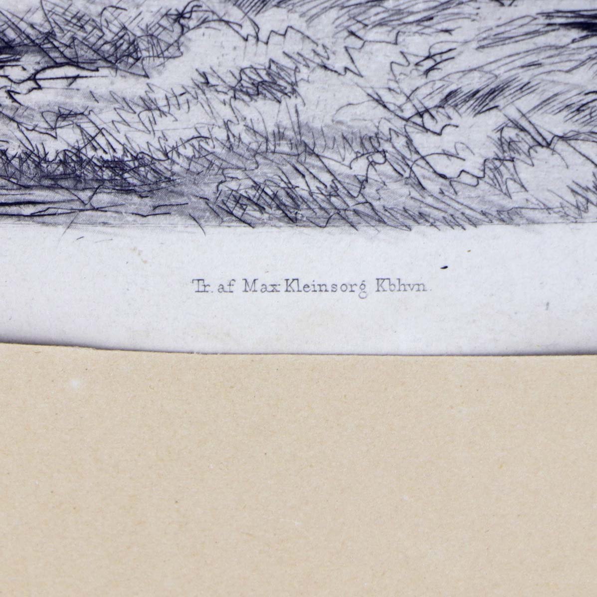 Indrammet radering med passepartout i træramme og havmotiv med redningsbåd på vej mod forlist skib.Kunstner Carl Locher, år 1900