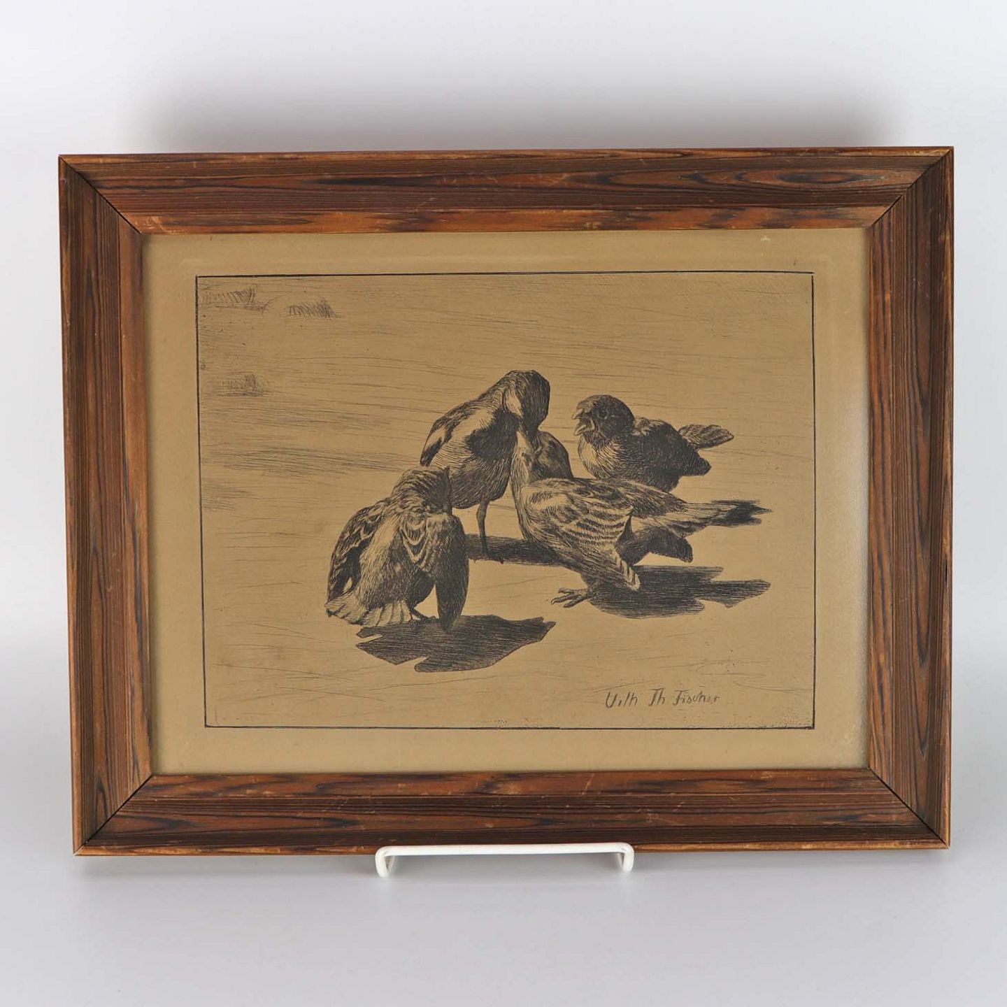 Indrammet radering på brunligt papir i træramme med motiv af fire gråspurve.Kunstner Vilhelm Th. Fischer