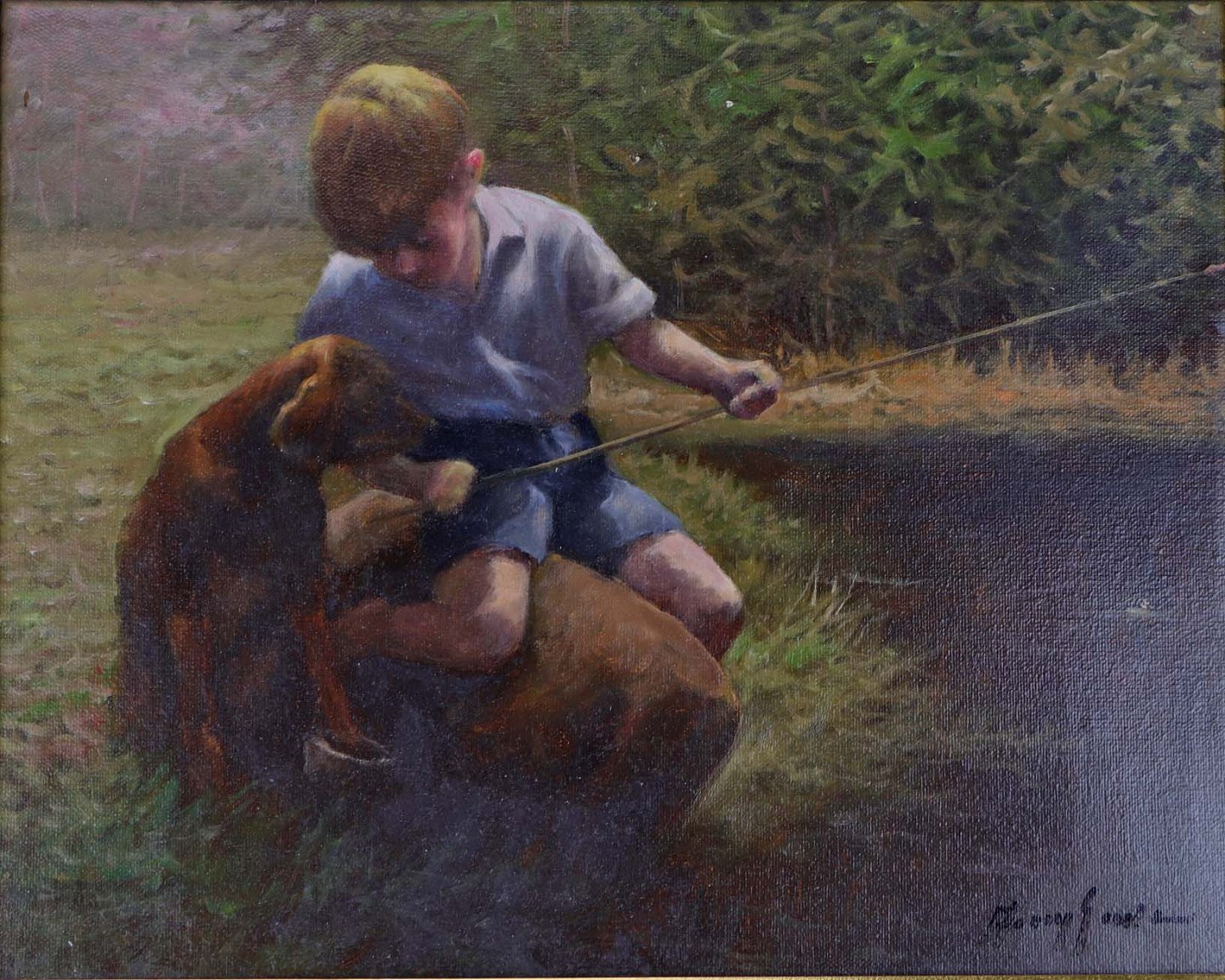 Maleri på lærred i guldmalet træramme med motiv af hund og dreng som fisker ved søKunstner Arling Gade (1919-2011)