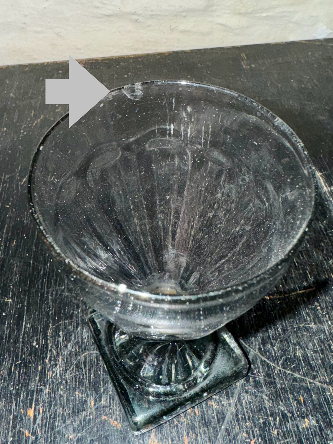 Vinglas fra Gjøvik Glasværk på firkantet fod. Fremstillet på det Norske glasværk omkring 1800. Glasset har desværre et skår indvendigt på kanten (se fotos). H. 10,5 cm