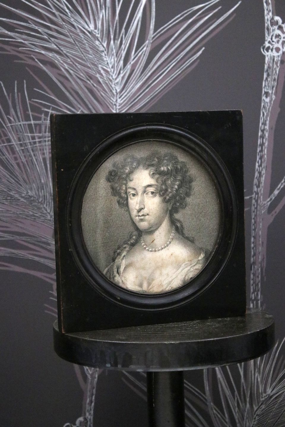 Antikt , lille gravur af Dronning Maria Stuart af Skotland 1542-67.indrammet i gammel sortmalet træ ramme. 17x15,5cm.
