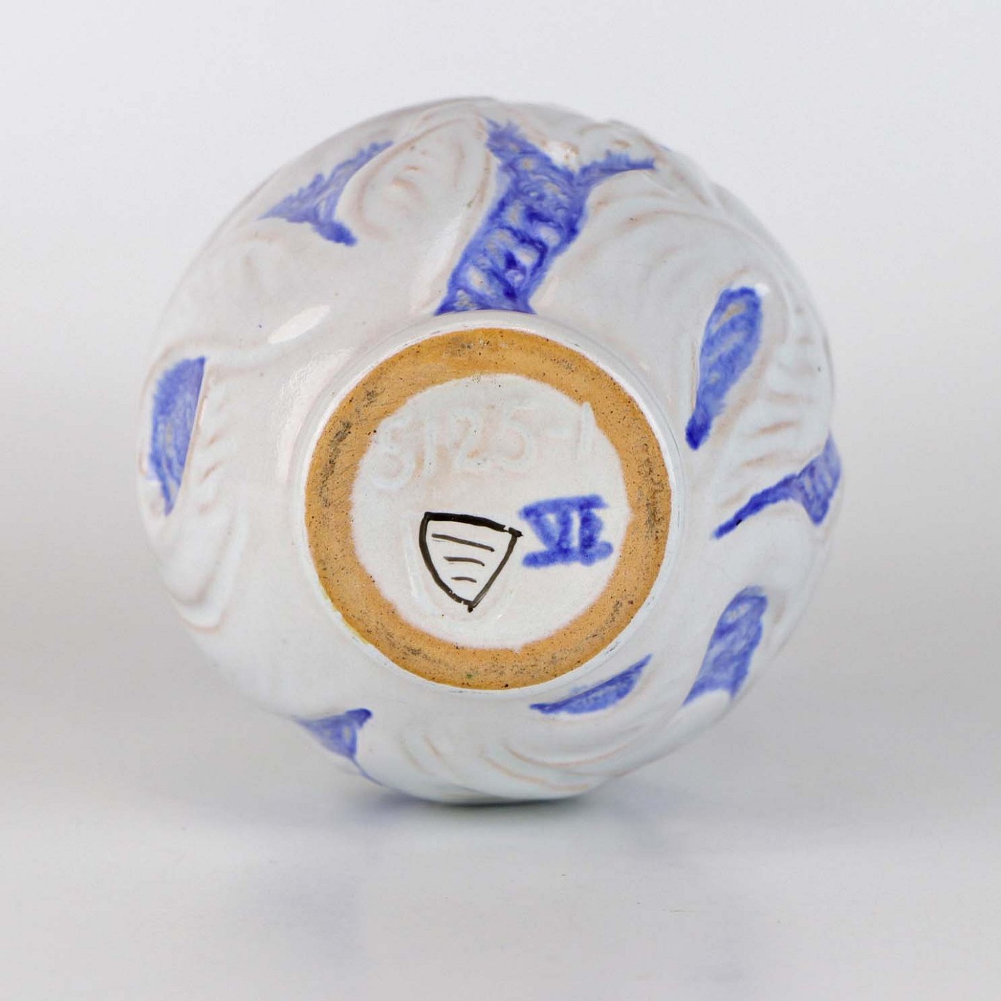Æggeformet vase i keramik med motiv af hvidglaserede blomster og blade på blåglaseret baggrund. Nr. 5125-1Producent Michael Andersen, Bornholmsk keramik