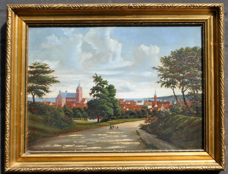 Holm, Peter (1798 - 1875) Danmark: Aarhus set mod syd med Domkirken og Klosterkirken. Olie på metalplade. Usigneret. 25 x 35 cm. Indrammet: 32 x 42 cm. Byen er her set fra Munkegade inden porten til byen. Kunstneren har lavet rigtig mange prospekter over Aarhus, men så vidt vides, er dette værk det eneste med dette motiv! NB: Der ydes ingen rabat på dette lot!Emne nummer: 27727