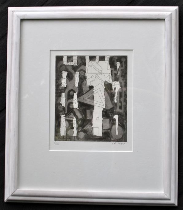 Ravn, Lars (1959 - ) Danmark: Komposition, 1989. Radering. Signeret: LR 1989. 6/10. H: 20 cm. B: 16,5 cm.Indrammet: H: 46 cm. B: 40 cm.