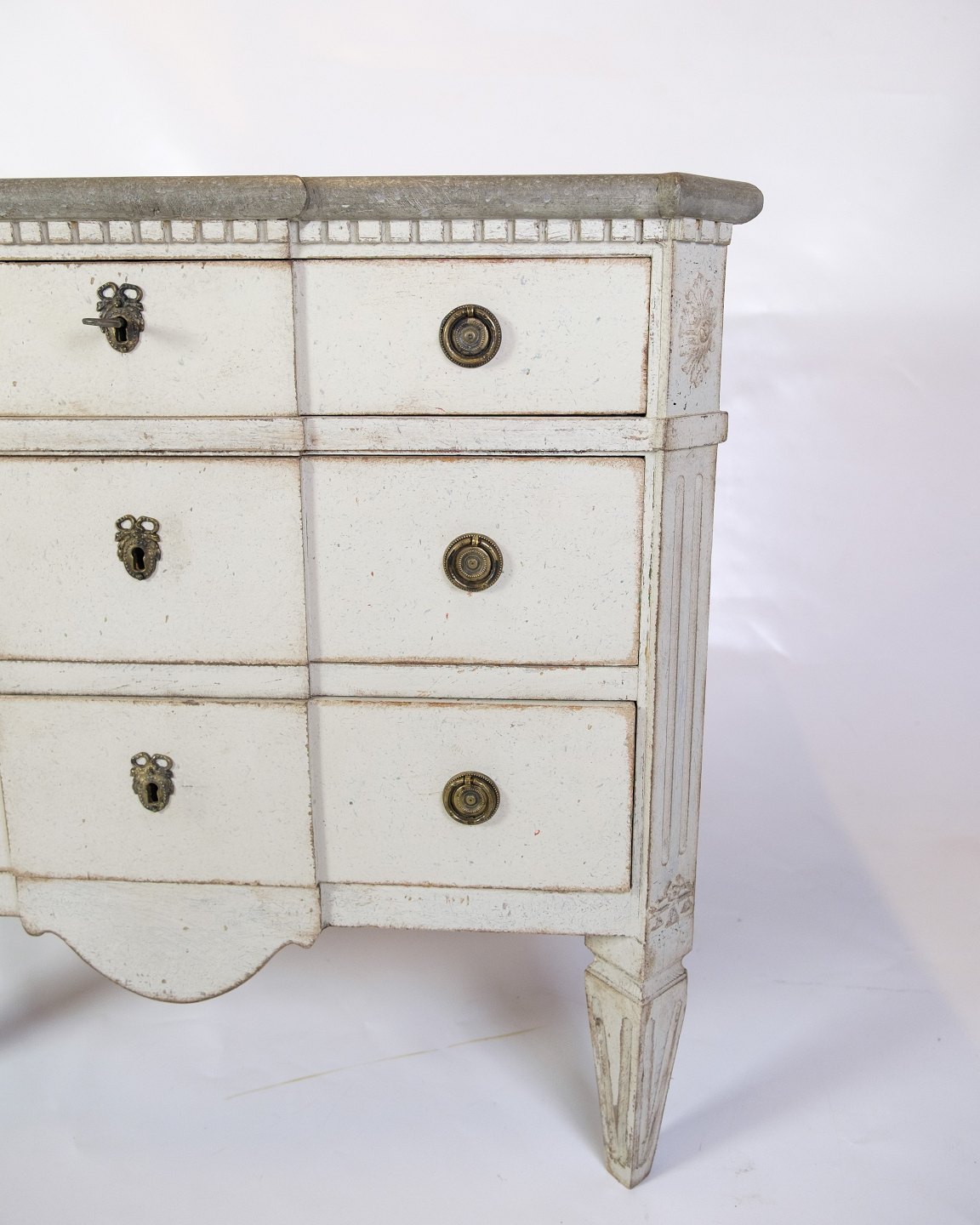Gustavian chest of drawers from the 1840s with three drawers, painted grey in a classic style. Top made of marbled wood, giving an elegant expression. Swedish origin with period carvings and details. An authentic piece of furniture with both function and decorative value.Dimensions: H:80cm W:86cm D:46.5cm
