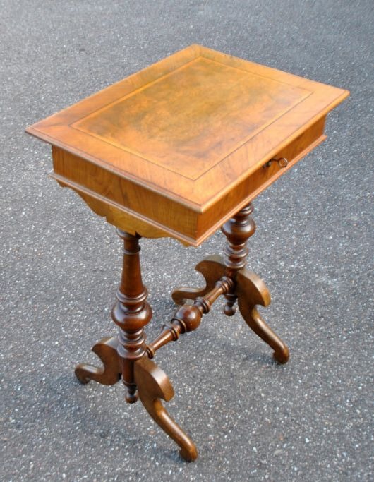Dansk sybord i valnød og valnødde rod, 19. årh. Med opklappelig plade med intarsia. Indvendig fire rum, hvoraf tre med låg, Med låg og nøgle. H.: 75 cm. B.: 53cm. D: 28 cm.Efter familietraditionen er det udført af Erwin Gianellis morfar, snedker Hansen.