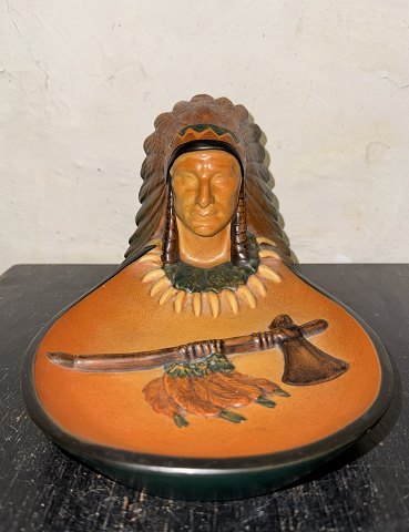 Indianer-høvding for enden af lavt keramik fad fra P. Ipsens Enke. Fremstår i perfekt stand. Uden skader eller reparationer. Fabriksmærket på bunden sammen med modelnummer 286. Mål: H. 14,2 cm L. 25 cm B. 16,5 cm.v/ Jesper Reutemann